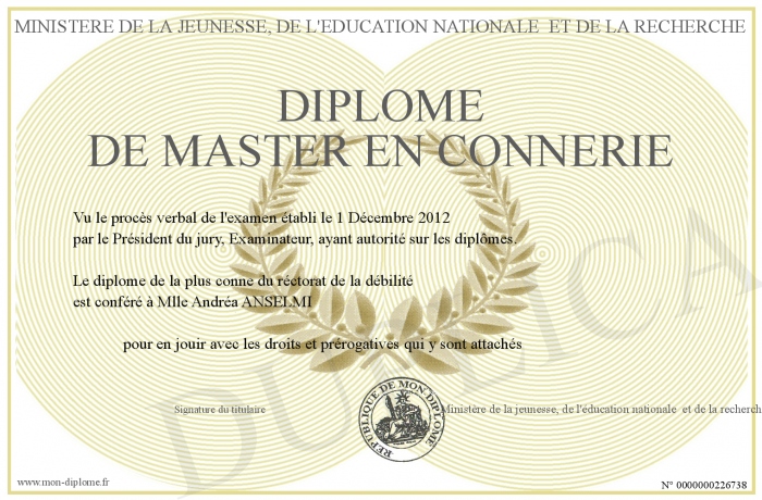 Envoyez par email votre Diplôme de master en connerie personalisé