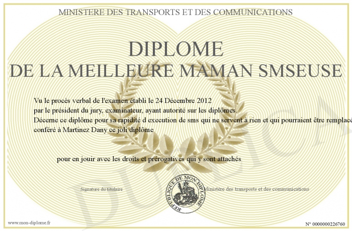 Envoyez par email votre Diplôme de la meilleure maman SMSeuse personalisé