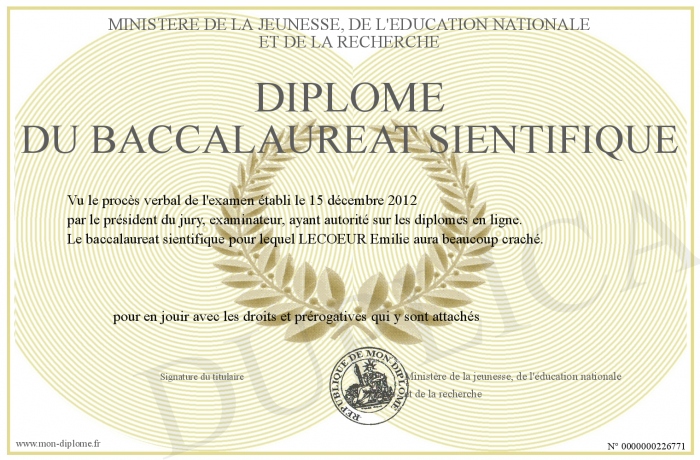 Envoyez par email votre Diplôme du baccalaureat sientifique personalisé