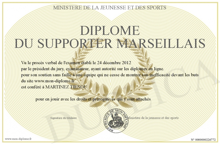 Envoyez par email votre Diplôme du SUPPORTER MARSEILLAIS personalisé