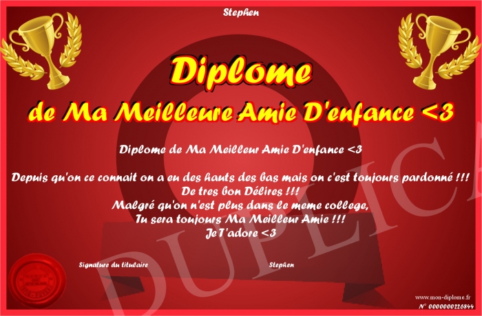 Envoyez par email votre Diplome de Ma Meilleure Amie D'enfance -3 personalisé