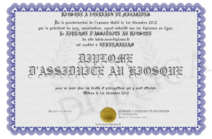 Envoyez par email votre DIPLOME D'ASSIDUITE AU KIOSQUE personalisé