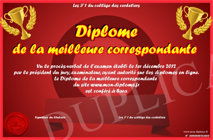 Envoyez par email votre Diplôme de la meilleure correspondante personalisé