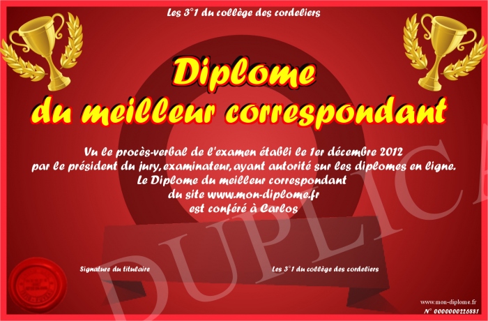 Envoyez par email votre Diplôme du meilleur correspondant personalisé
