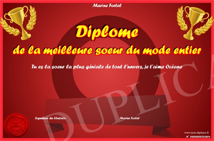 Envoyez par email votre Diplôme de la meilleure soeur du mode entier personalisé