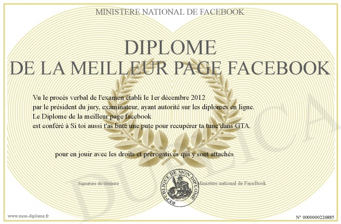 Envoyez par email votre Diplôme de la meilleur page facebook personalisé