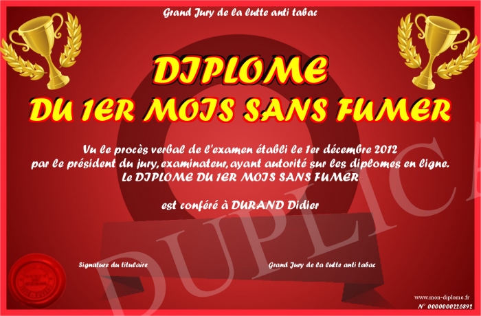 Envoyez par email votre DIPLOME DU 1ER MOIS SANS FUMER personalisé