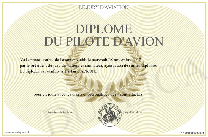 Envoyez par email votre Diplôme du pilote d'avion personalisé