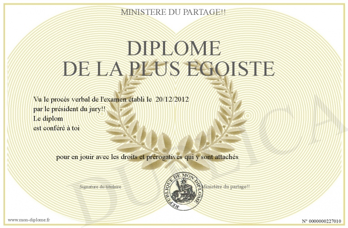 Envoyez par email votre Diplôme de la plus égoiste personalisé