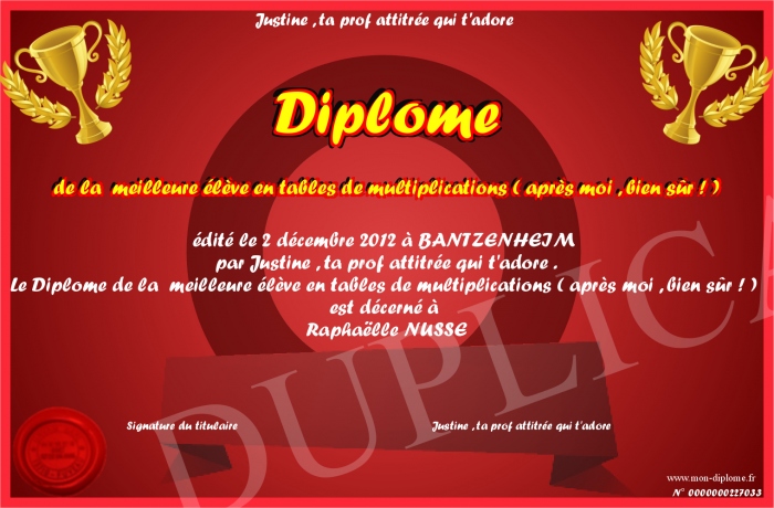 Envoyez par email votre Diplôme de la meilleure élève en tables de multiplications ( après moi , bien sûr ! ) personalisé