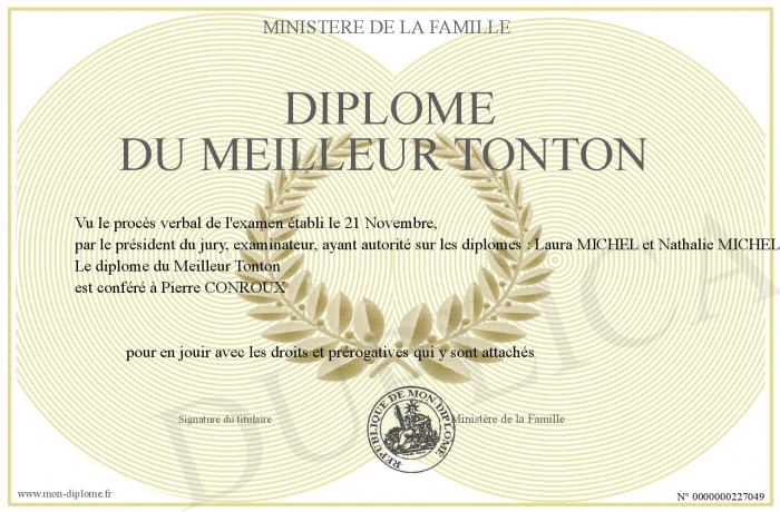 Envoyez par email votre Diplôme du Meilleur Tonton personalisé