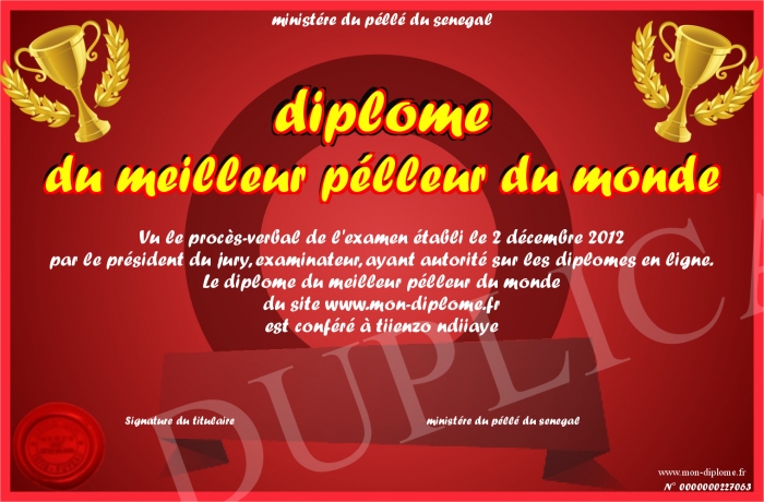Envoyez par email votre diplome du meilleur pélleur du monde personalisé