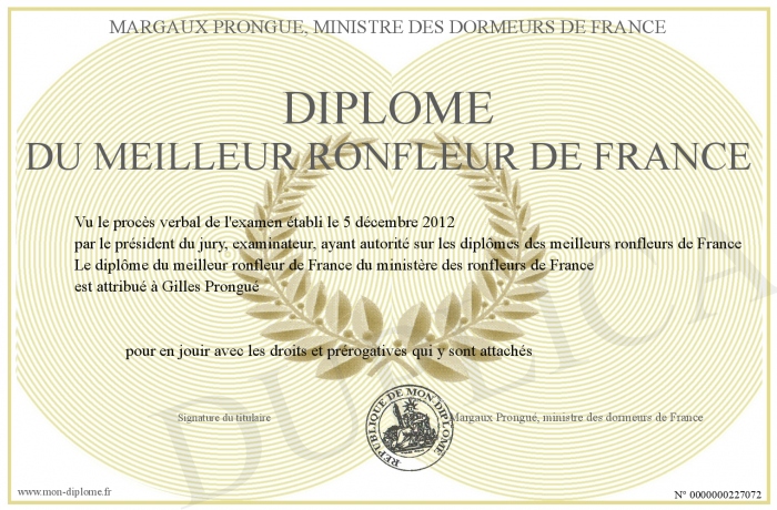 Envoyez par email votre Diplôme du meilleur ronfleur de France personalisé