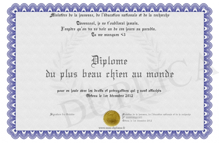 Envoyez par email votre Diplôme du plus beau chien au monde personalisé