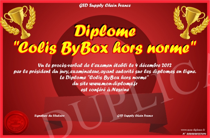 Envoyez par email votre Diplôme -Colis ByBox hors norme- personalisé