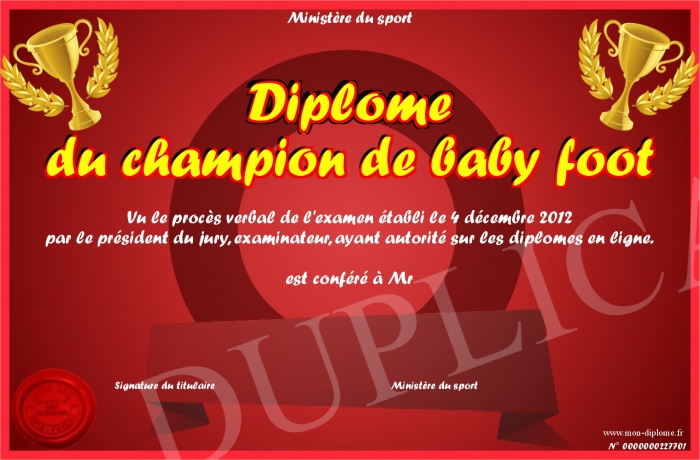 Envoyez par email votre Diplôme du champion de baby foot personalisé