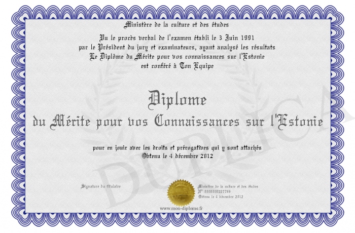Envoyez par email votre Diplôme du Mérite pour vos Connaissances sur l'Estonie personalisé