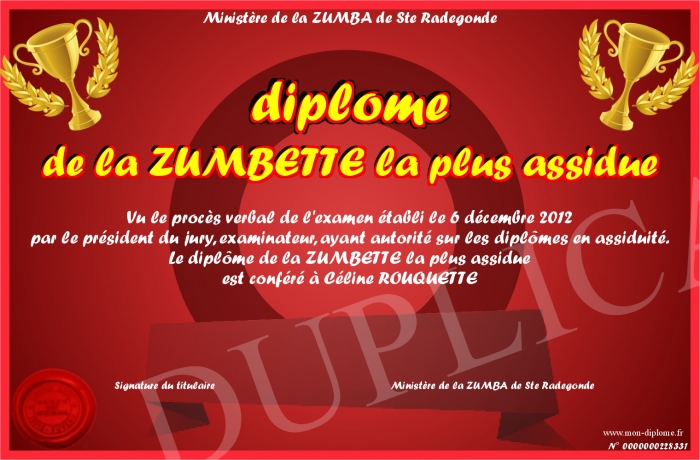 Envoyez par email votre diplôme de la ZUMBETTE la plus assidue personalisé