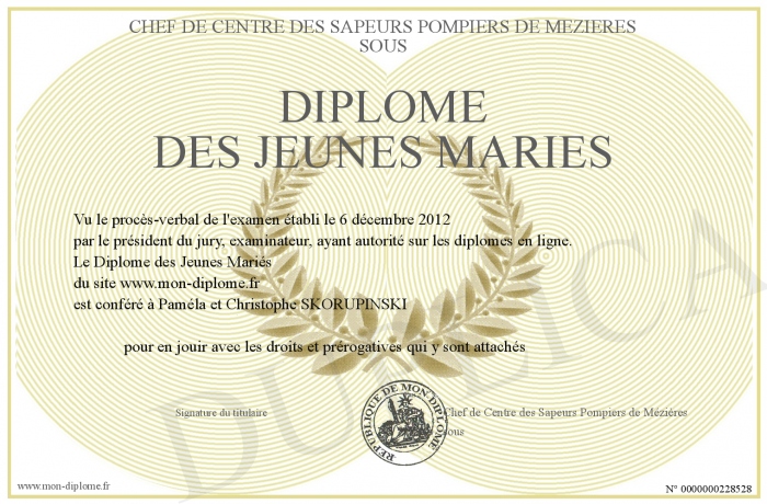 Envoyez par email votre Diplôme des Jeunes Mariés personalisé