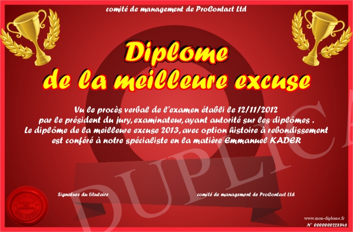 Envoyez par email votre Diplôme de la meilleure excuse personalisé
