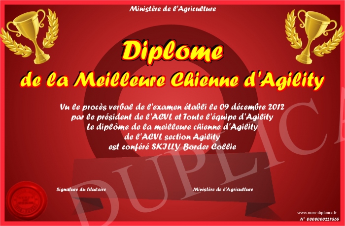 Envoyez par email votre Diplôme de la Meilleure Chienne d'Agility personalisé