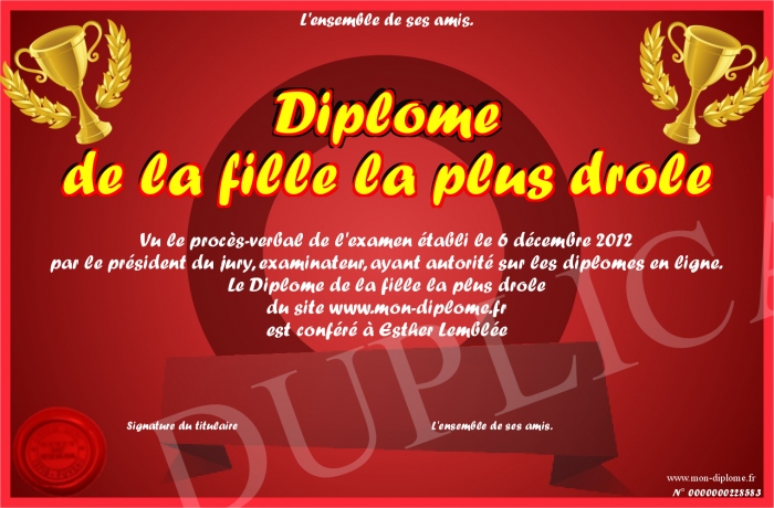 Envoyez par email votre Diplôme de la fille la plus drôle personalisé