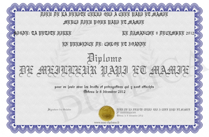 Envoyez par email votre Diplôme DE MEILLEUR PAPI ET MAMIE personalisé