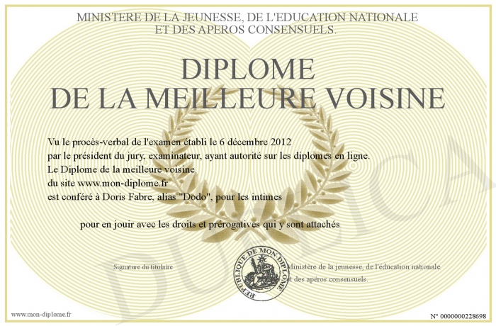 Envoyez par email votre Diplôme de la meilleure voisine personalisé