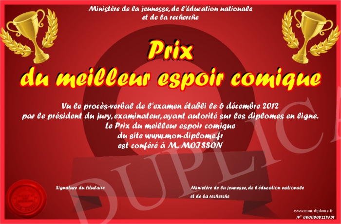 Envoyez par email votre Prix du meilleur espoir comique personalisé