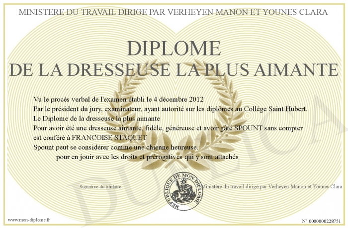 Envoyez par email votre Diplome de la dresseuse la plus aimante personalisé
