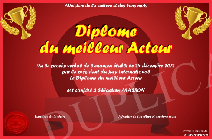 Envoyez par email votre Diplôme du meilleur Acteur personalisé