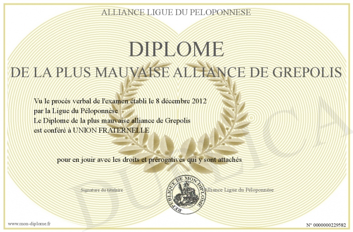 Envoyez par email votre Diplôme de la plus mauvaise alliance de Grepolis personalisé