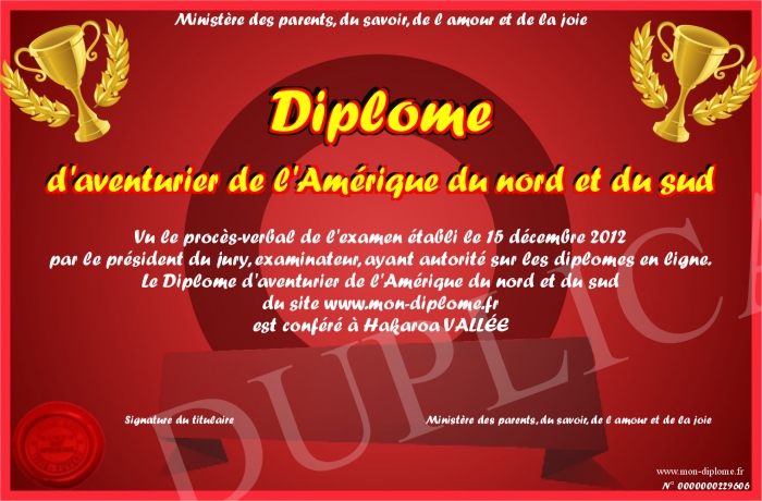 Envoyez par email votre Diplôme d'aventurier de l'Amérique du nord et du sud personalisé