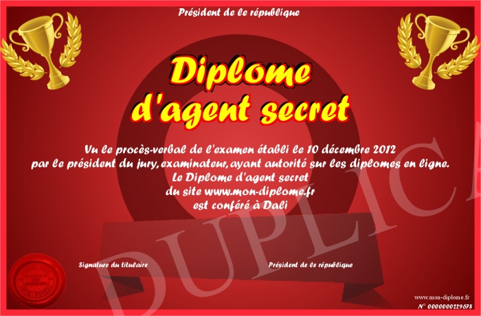 Envoyez par email votre Diplôme d'agent secret personalisé