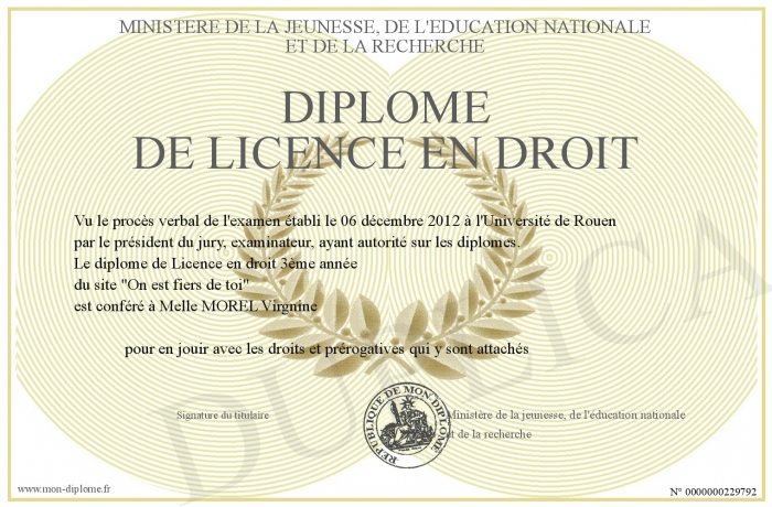 Envoyez par email votre Diplôme de Licence en Droit personalisé