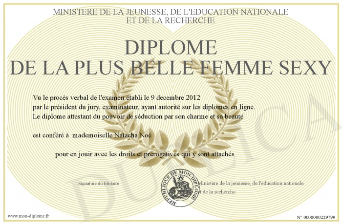 Envoyez par email votre Diplôme DE LA PLUS BELLE FEMME SEXY personalisé