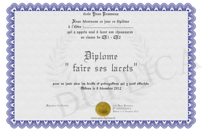 Envoyez par email votre Diplôme - faire ses lacets- personalisé