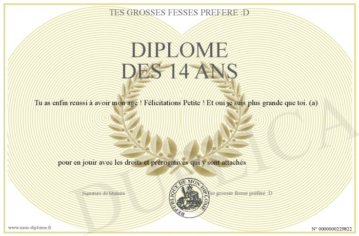 Envoyez par email votre Diplôme des 14 ans personalisé