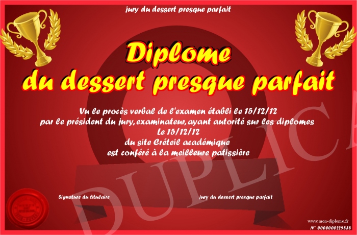 Envoyez par email votre Diplôme du dessert presque parfait personalisé