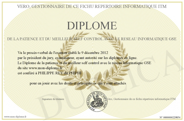 Envoyez par email votre Diplome de la patience et du meilleur self control avec le réseau Informatique GSE personalisé
