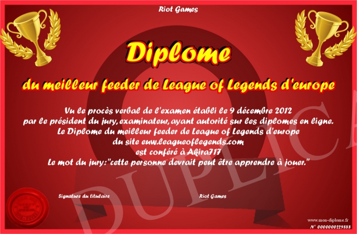 Envoyez par email votre Diplôme du meilleur feeder de League of Legends d'europe personalisé