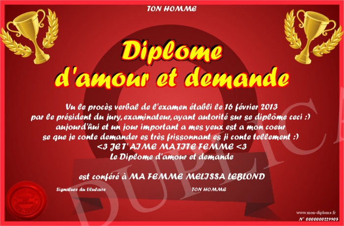 Envoyez par email votre Diplôme d'amour et demande personalisé