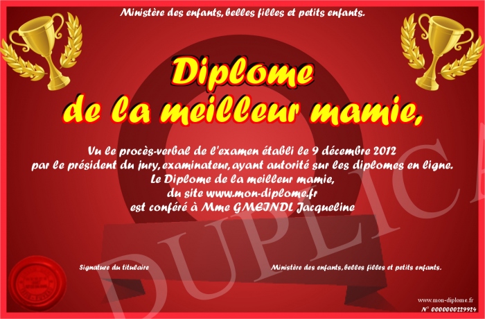 Envoyez par email votre Diplôme de la meilleur mamie, personalisé