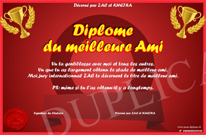 Envoyez par email votre Diplome du meilleure Ami personalisé