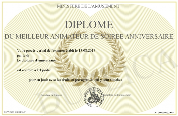 Envoyez par email votre Diplôme du meilleur animateur de soirée anniversaire personalisé