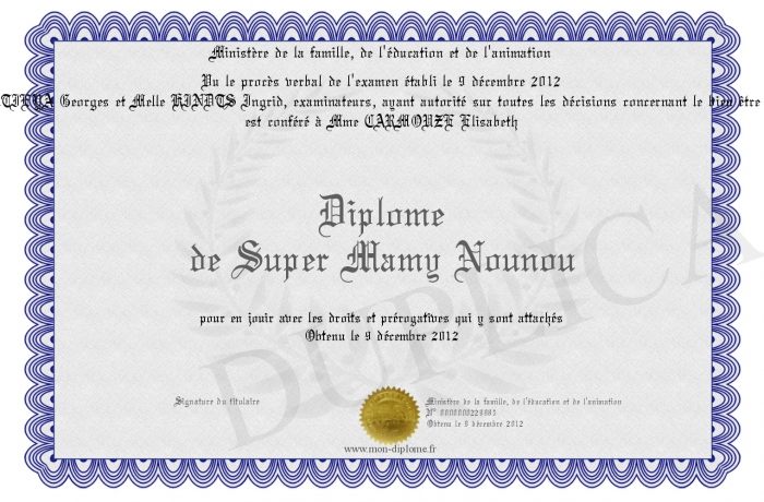 Envoyez par email votre Diplôme de Super Mamy Nounou personalisé