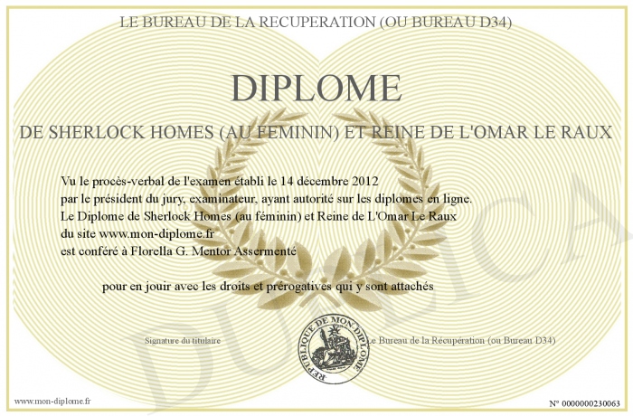 Envoyez par email votre Diplôme de Sherlock Homes (au féminin) et Reine de L'Omar Le Raux personalisé