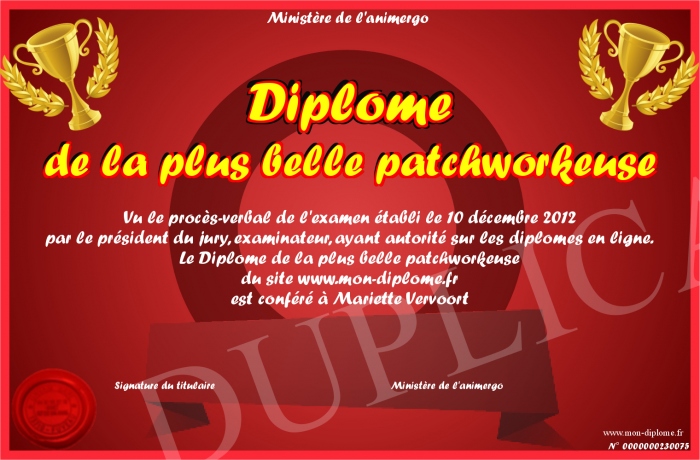 Envoyez par email votre Diplôme de la plus belle patchworkeuse personalisé
