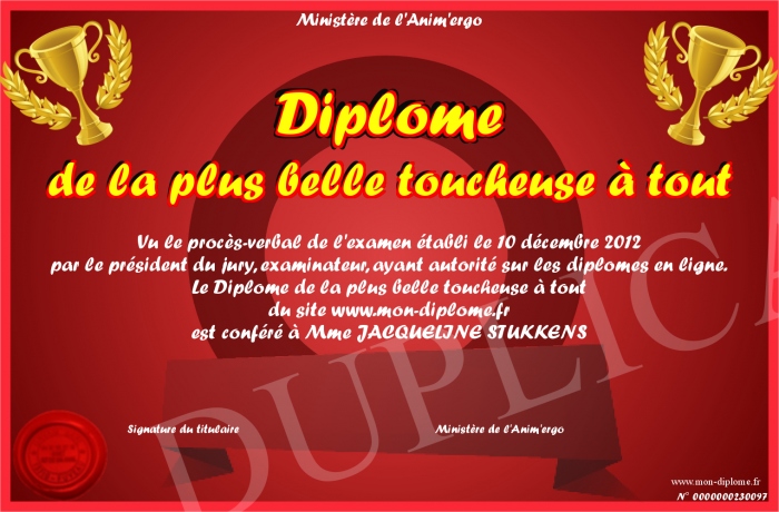 Envoyez par email votre Diplôme de la plus belle toucheuse à tout personalisé