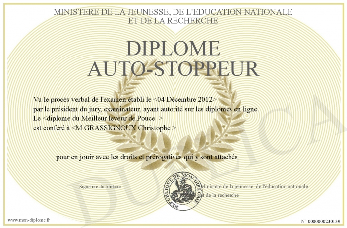 Envoyez par email votre Diplome Auto-Stoppeur personalisé